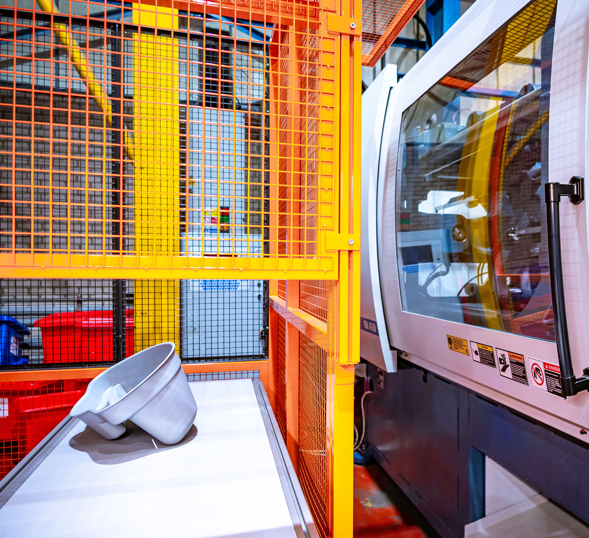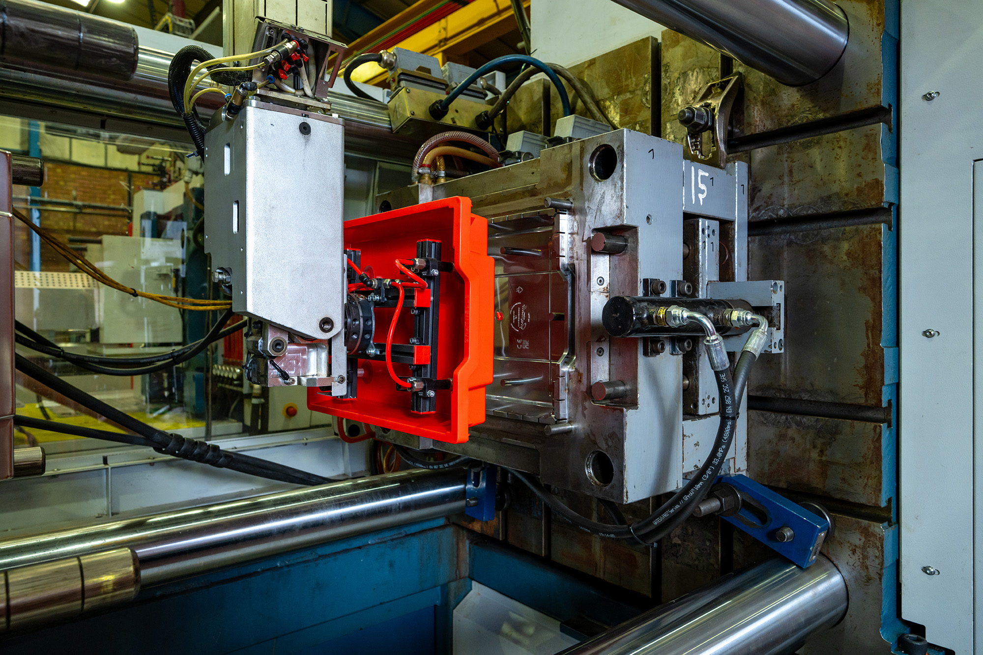 The mould inside the machine comprises of two halves, one half male and the other female. When the machine closes this enables molten plastic to inject into the mould and the cycle time also allows the moulding to cool. Inside the tool are water circuits to reduce the material temperature from about 200 degrees C to about 60 degrees C. When the mould opens the product is then ejected and a robot will then lift the moulding onto a conveyor belt.